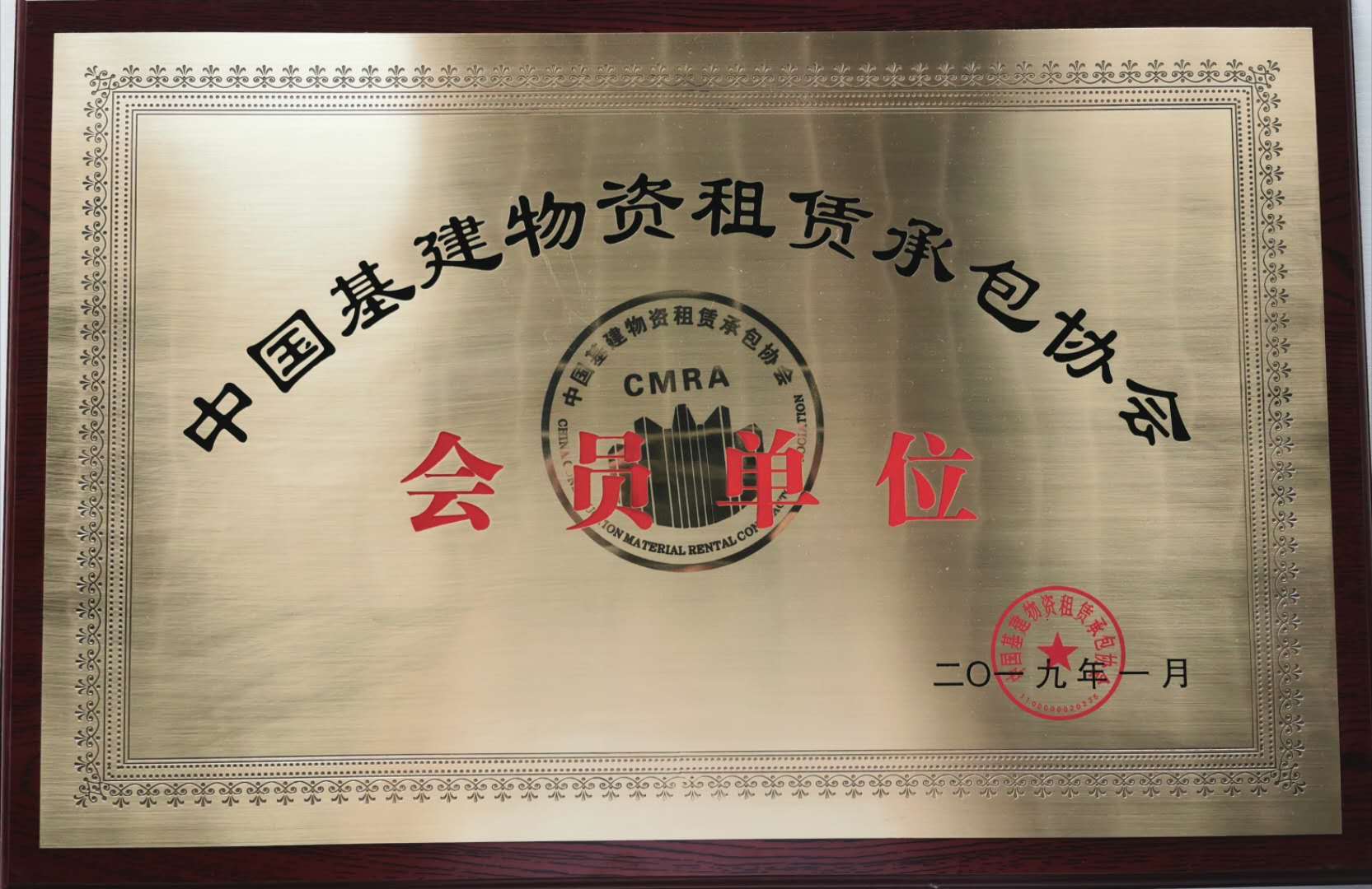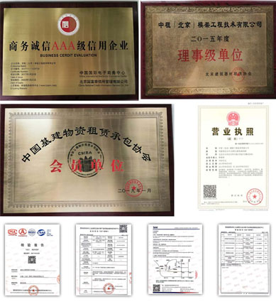 中国基建物资租赁承包协会颁发《会员单位》、中国建筑器材租赁协会颁发的《理事级单位》、商务诚信AAA级信用企业、营业执照、