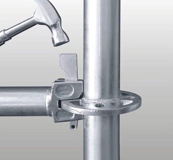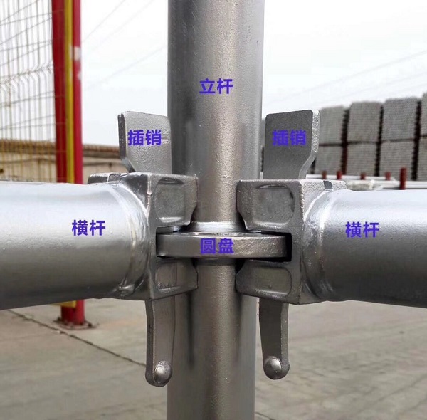 圆盘:一般为10mm厚,材质为Q235B钢板。 楔性销:用于锁定横杆头、斜拉头与圆盘。 斜拉头:用楔形销卡于圆盘大孔上。 横杆头:用楔形销卡于圆盘小孔上。 可调底座:用于调节垂直高度。