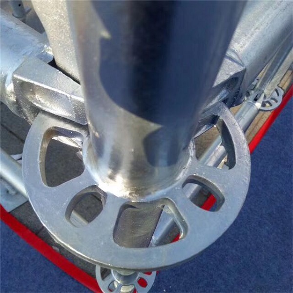 立杆:通常采用Q345材质的φ48×3.25钢管进行热镀锌工艺处理,依长度而设计,每0.5米焊一个圆盘,一端头有连接棒。